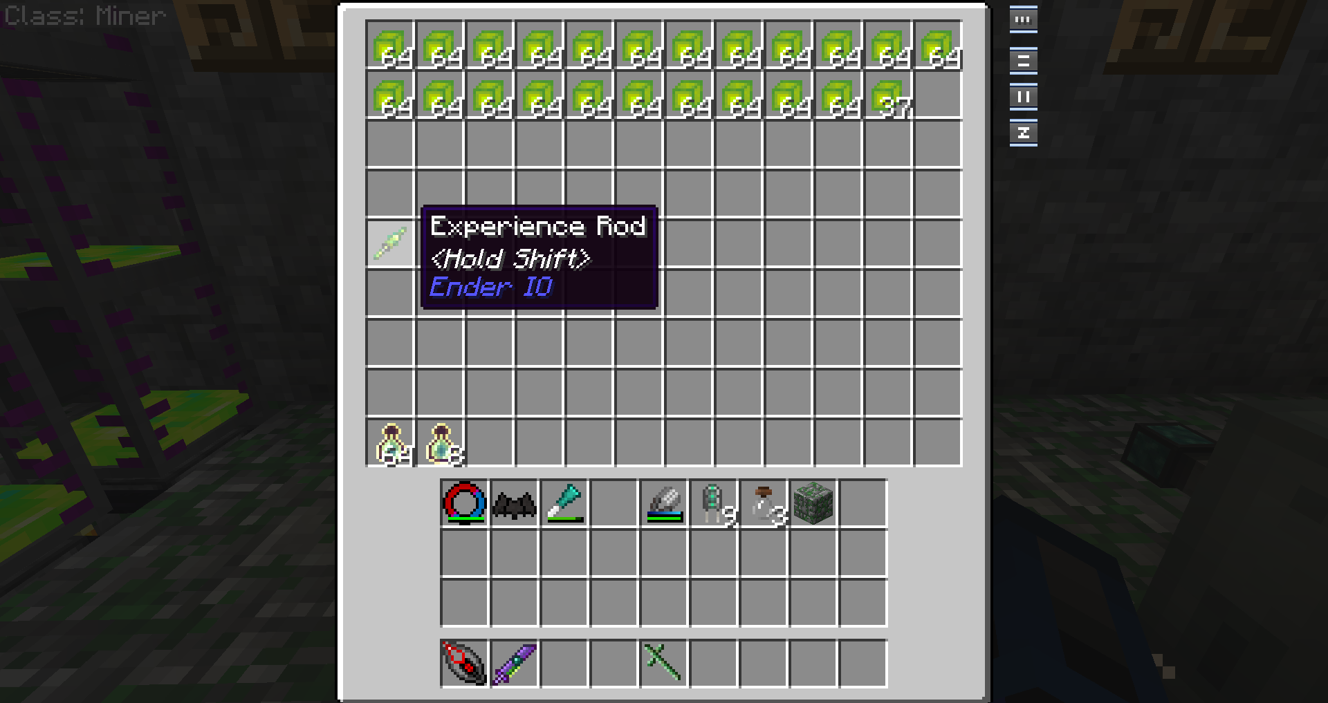 As for the experience in the tower we can use the Ender IO rod to transfer xp out of the tanks to the player themselves, and then use the solidifier to transmute the experience into solid experience blocks for storage. There's probably a better way to do this, I'll be looking into possibilities.