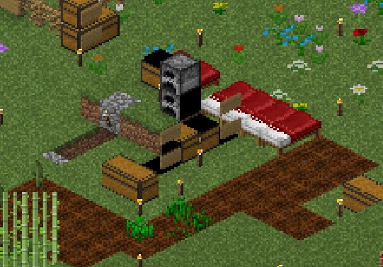 First is a tavern-kitchen, teaming with Mupje. A wooden building on short posts, of dark brownish color with some brighter ceiling maybe. With a nice room for preparing food and a room for consuming food, so folks could drop in passing by and grab a bite. Food can be partly on the tables (if we have Bibliocraft-like things), partly in fridges, etc. Food like vanilla MC cakes for quick grabbing could be nice.