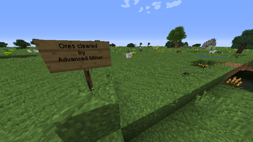 In the mining dimension I've cleared a 32x32 block area with the IC2 Advanced Miner. This miner was set to only dig up ores, much like the Digital Miner from Mekanism does. Since you can't see the cleared area from the surface I've marked it with dirt and a sign like this: