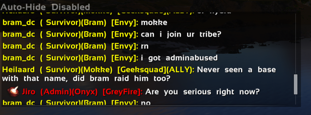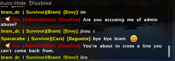 Jiro: It has been several days since I gave Bram a second chance. Every day I've checked on the server chat logs I've seen Bram talking negatively about actions I've taken or things happening on the server overall. I was promised by Bram that he would not negatively impact the community which appears to have been broken. This negative attitude toward me is exactly what I said would happen if I allowed him to remain, so I'm simply done with this player. I will not respond to any ban appeals about this player.