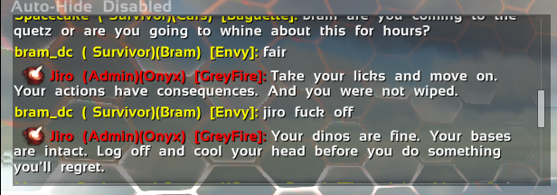 Player was upset because he was attacked after having attacked another player and participating in another tribe's raid. The player doesn't seem to understand that he's playing on a PvP server, and that other players have just as much rights as he does to attack and raid whoever they want. The player started ranting about Jiro breaking the rules, citing things like he wiped his base, everything he was doing was illegal, etc. Then started accusing Jiro of admin abuse repetitively. Jiro attempted to diffuse the situation by having him log off and cool off, but the player continued his ranting. This probably went on for an hour or more. Eventually Jiro attempted to mute the player, but the command syntax was incorrect. The player started accusing Jiro of abuse again, so then he was banned.